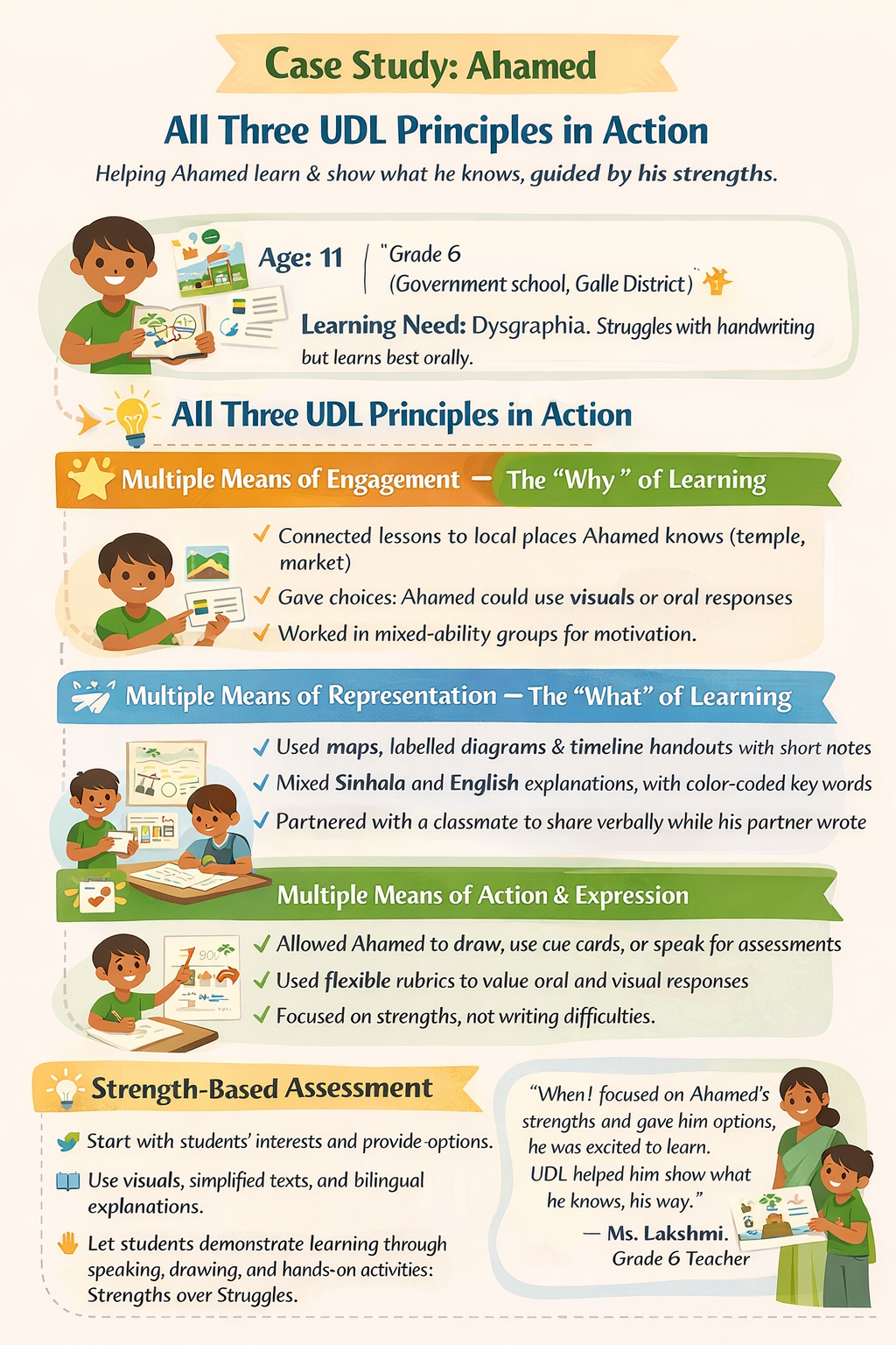 Ahamed paid attention in lessons but rarely completed written tasks. During Social Studies, he could explain ideas verbally but became frustrated when copying long notes from the board. His teacher, Ms. Lakshmi, wanted to support him using UDL so he could access content, engage in learning, and demonstrate understanding effectively.