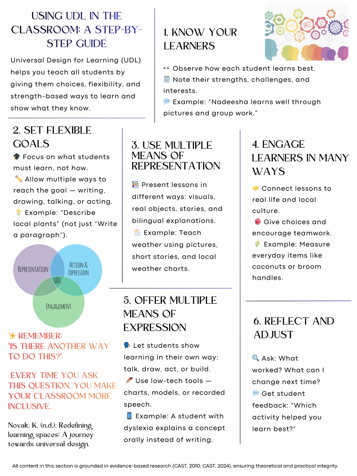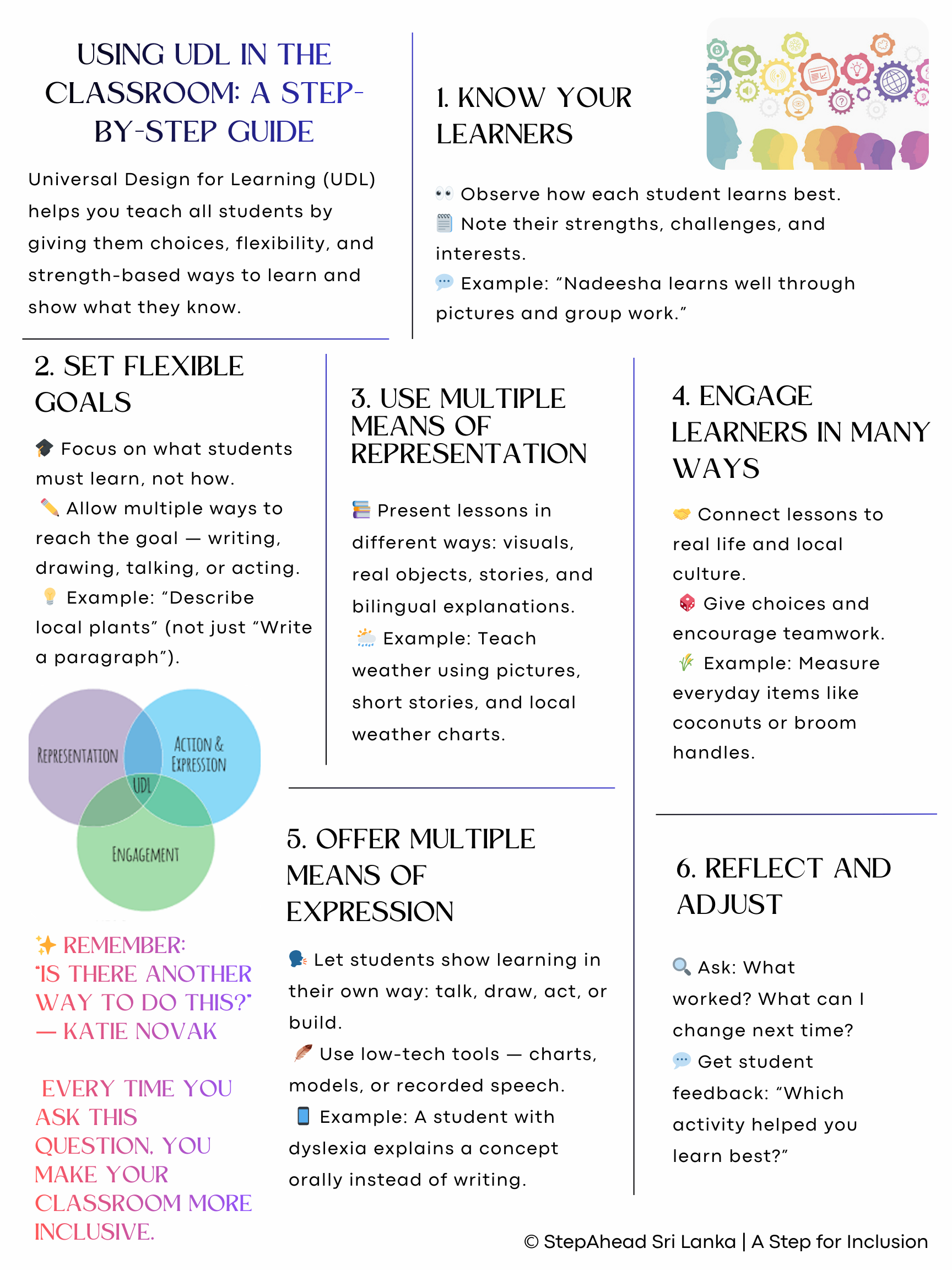To help teachers apply UDL principles in real classrooms, StepAhead Sri Lanka offers a one-page UDL Self-Guide leaflet. This printable handout summarizes the three core UDL principles with simple reminders.