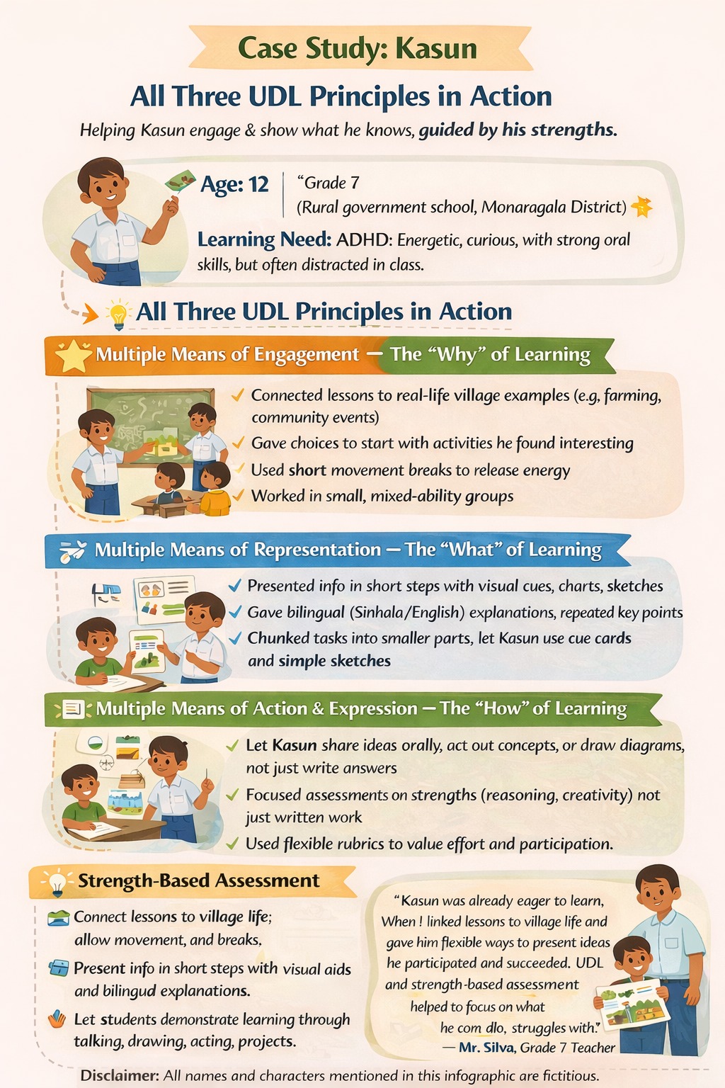 Kasun’s teacher, Mr. Silva, noticed that he often left tasks incomplete, became distracted during lessons, and disrupted peers unintentionally. Traditional teaching methods such as long explanations, copying from the board, and individual written exercises which did not match his learning style. Mr. Silva wanted to support Kasun using UDL so he could remain engaged, access content, and demonstrate understanding in ways suited to his strengths.